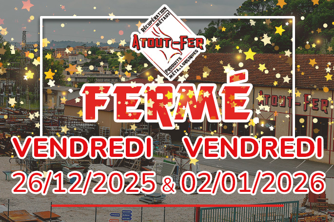 Pour le we de l’ascension, la société Atout-Fer sera exceptionnellement fermée du jeudi 26 mai au dimanche 29 mai 2022. Merci de votre compréhension.